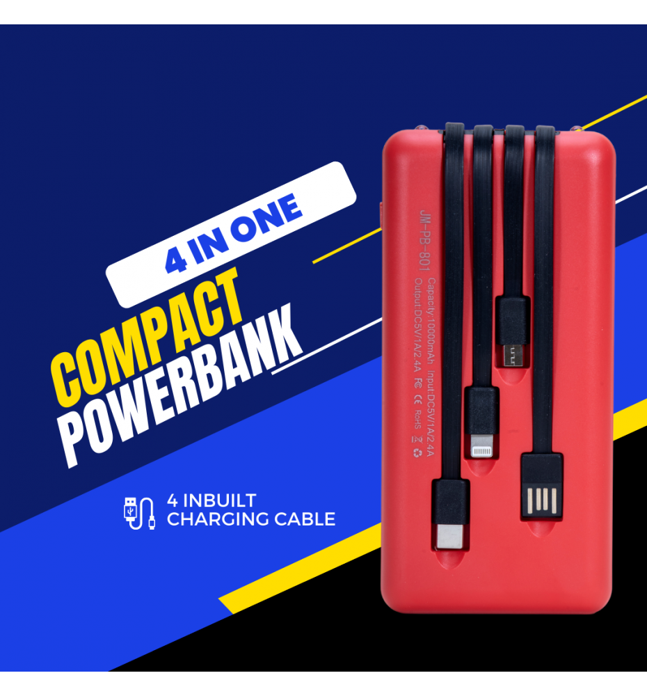 Jmax JM-PB-801 is 4 IN ONE slim fit, travel friendly, universal 10000mAh Power Bank offers 4 inbuilt charging cables and two inputs ports.